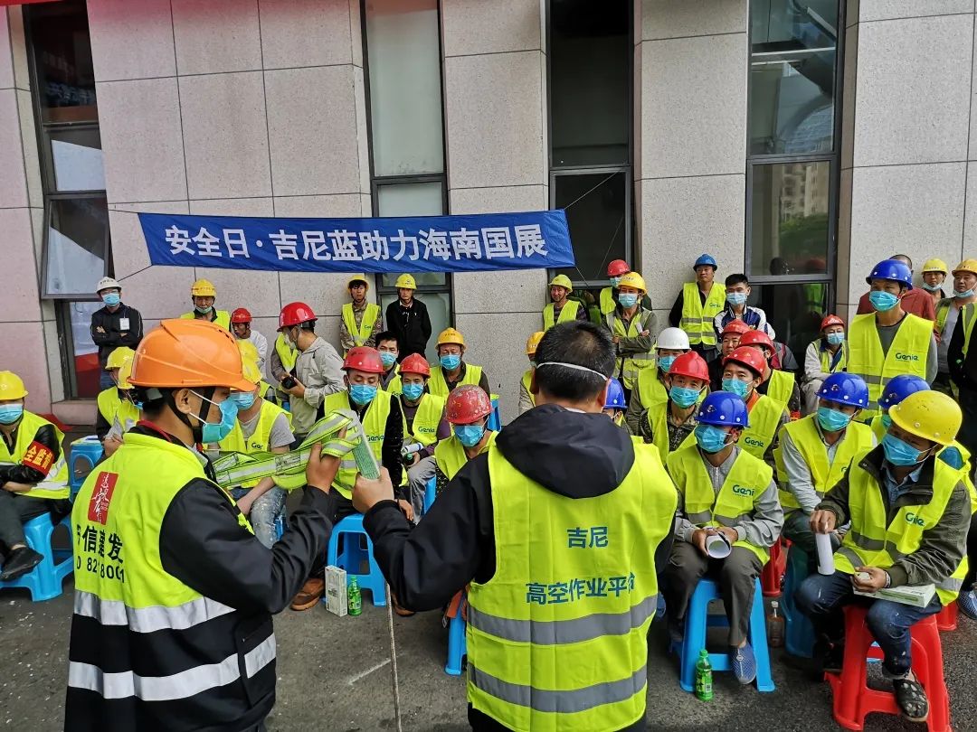 4月24日,吉尼携手宏信建发在海南会展中心二期举办了安全日活动, 组织现场设备操作工及安全管理部门人员详细讲解了高空车安全操作规范、违规操作演示和故障排查方法,并进行了设备安全操作演示。