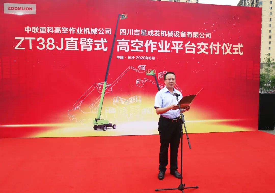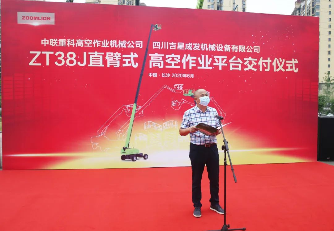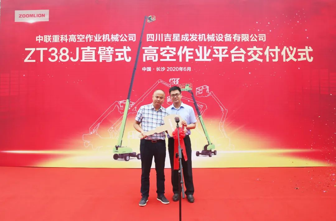 转载 2020-06-05 09:08 中联重科 来源:中联重科6月1日,中联重科高空作业机械公司与四川吉星成发机械设备有限公司ZT38J直臂式高空作业平台交付仪式隆重举行。中联重科高空作业机械公司总经理任会礼、中联重科高空作业机械公司总经理助理王建、中联重科高空作业机械营销公司副总经理陈剑锋、四川吉星成发机械设备有限公司董事长李德俊等9名联盟客户代表及相关人员参加了本次活动。