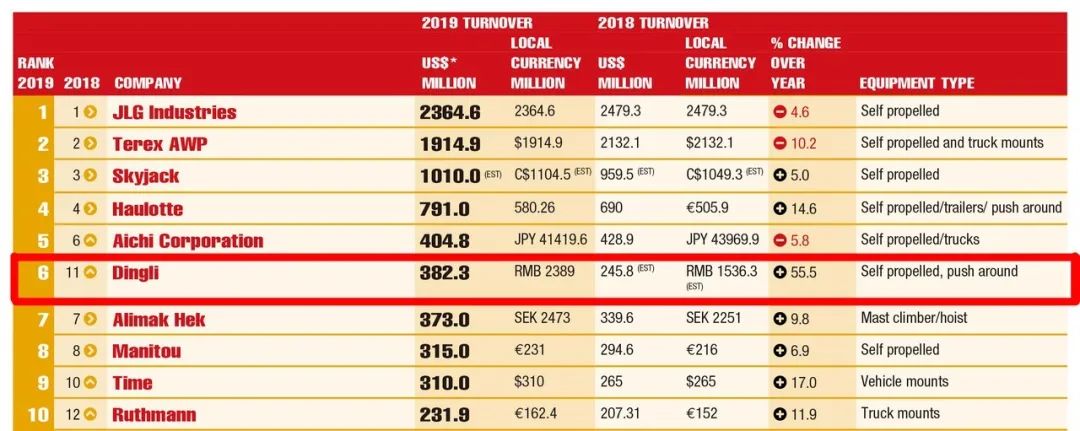 榜单中,浙江鼎力较去年排名大幅靠前,位列第6位。