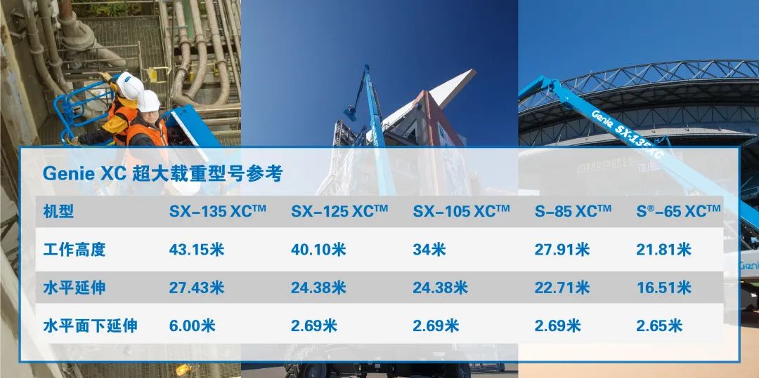 Genie® SX™-125 XC™采用了全新的设计方案,产品性能全面升级。水平延伸范围达24.38米,短臂垂直旋转角度范围135°,能完美覆盖到32米-38.12米超高的工作范围,轻松跨越障碍物。车身精巧紧凑,占地面积仅有3.94米x4.11米,多台高空车同时作业,在狭窄的室内空间施工也能灵活移动,工作效率自然不在话下。平台载重454公斤,可以同时容纳三个操作人员,携带更多的物料进行高空作业,省去了上下频繁拿取安装物料的时间。