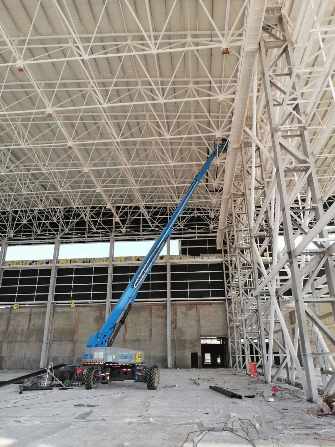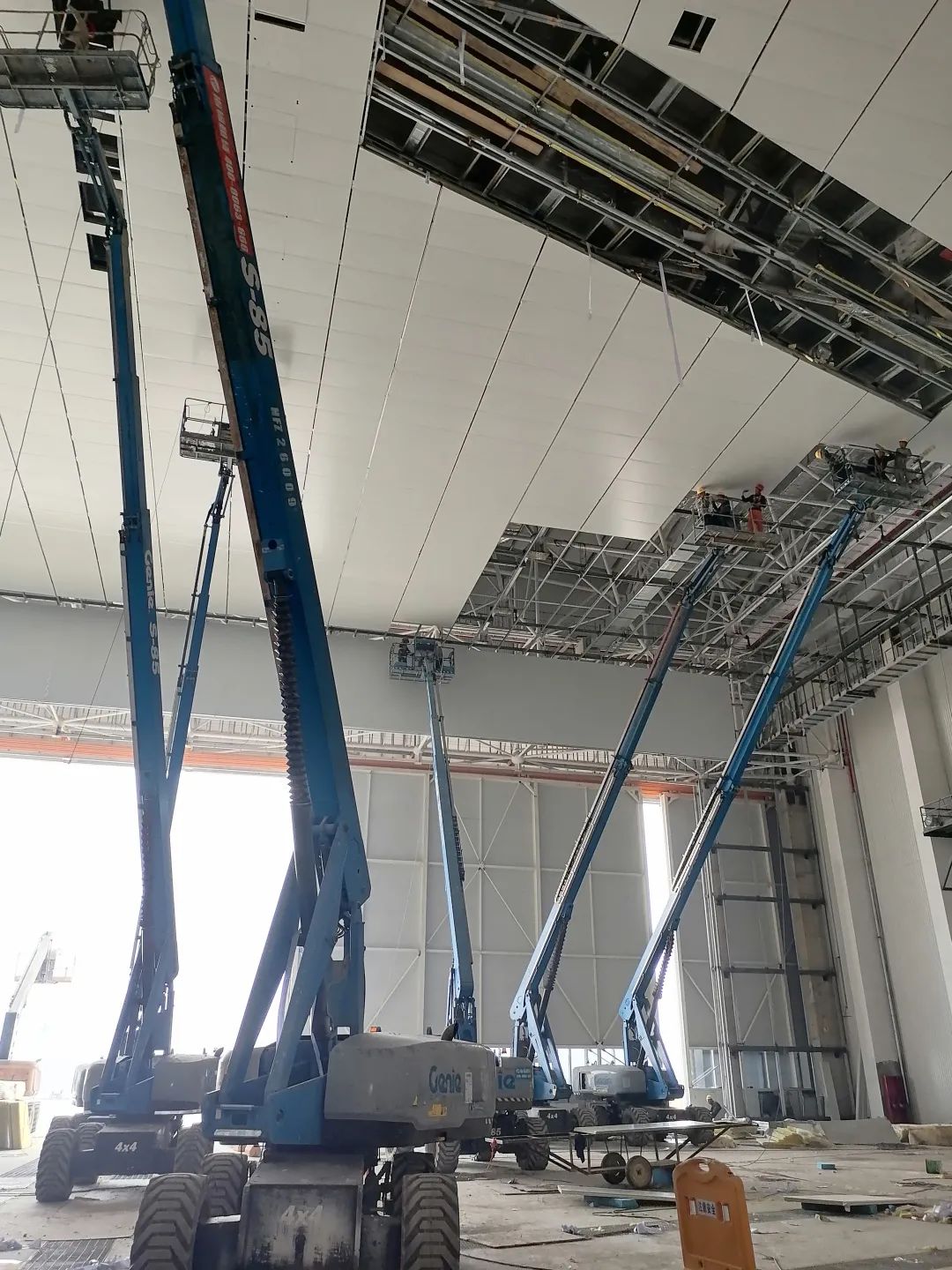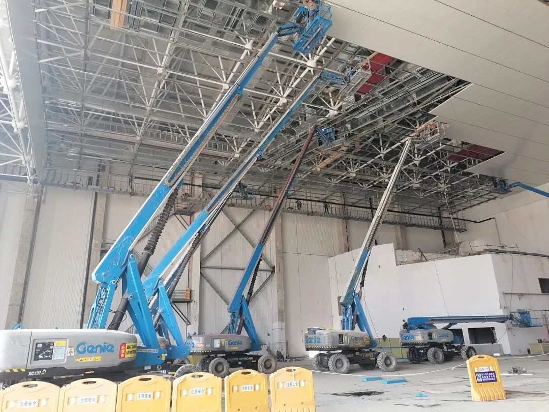交付中心、完工中心、喷漆机库三大主体建筑的钢网架整体拼装面积突破了1.2万平方米,总用钢量超4,000吨。最大跨度达120米,提升高度近30米。主体建筑屋顶面板安装面积大,工程进度赶,需要设备占地面积小,移动起来灵活方便,才能更快地提高工作效率。吉尼超大载重系列高空作业平台在这个项目中大显身手,被施工方称赞为 “多变能手“。