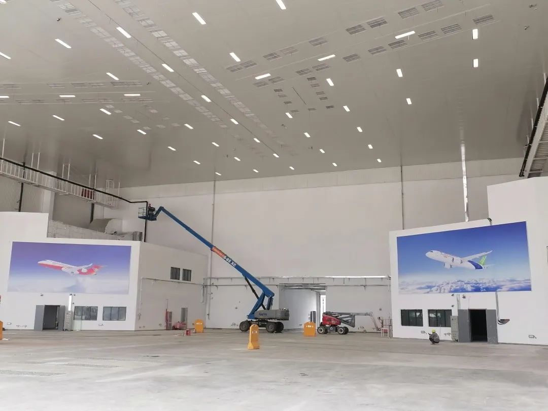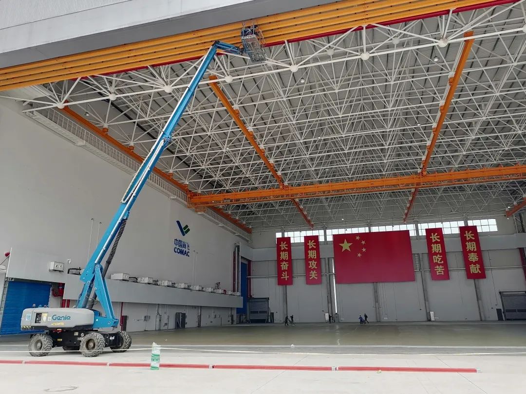 中国商飞江西生产试飞中心项目占地面积24.5万平方米,建筑面积约4.6万平方米,主要包括交付中心、完工中心、喷漆机库等16个建筑单体及机坪区。项目正式投产后,可实现每年完工交付约30架次飞机的产能目标。建筑高峰期多达几十台吉尼高空车同时出动助力试飞中心项目的顺利完工。