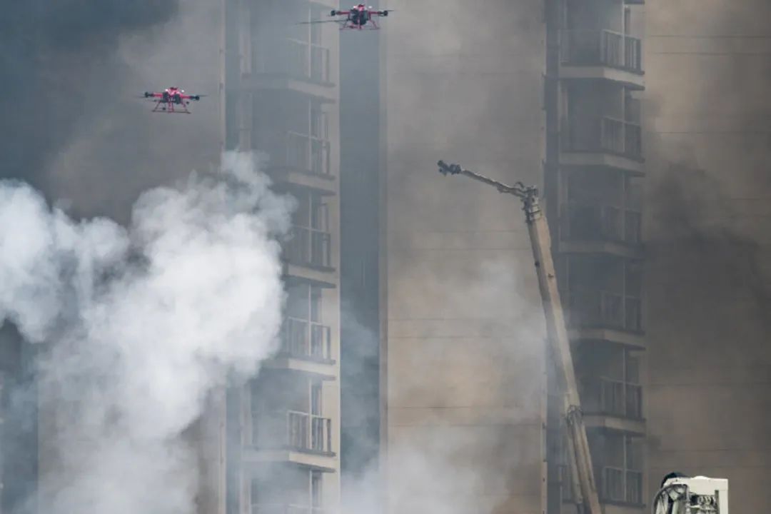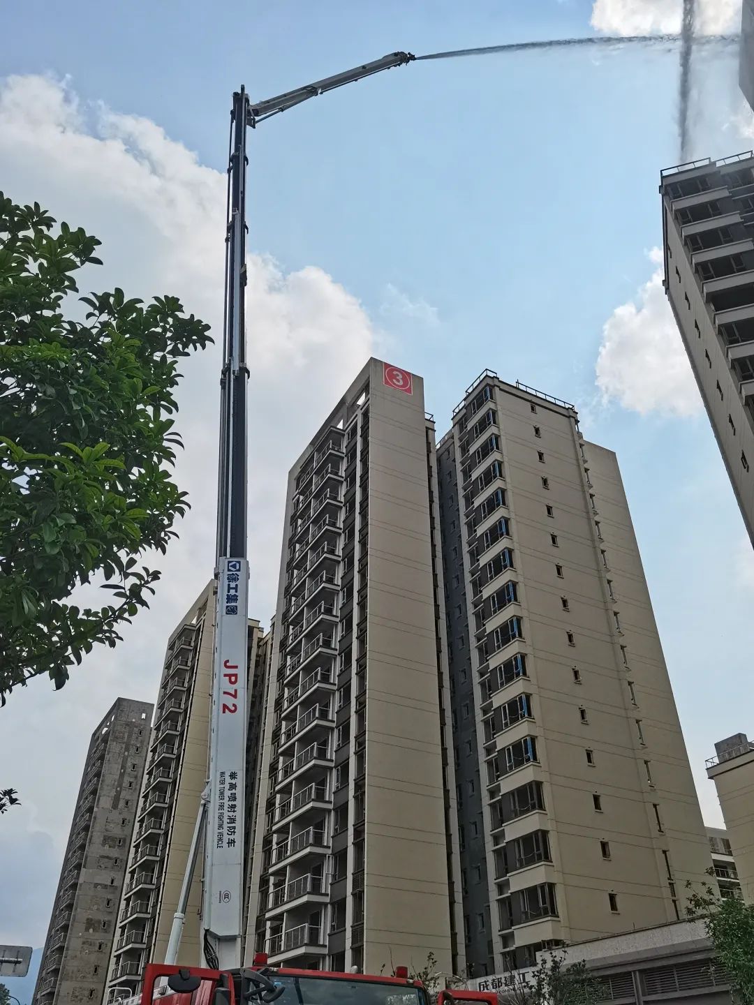演习场上,徐工两台高米数举高喷射消防车迅速擎起钢铁巨臂,精准撑起生命保护伞,高效完成高层灭火任务。