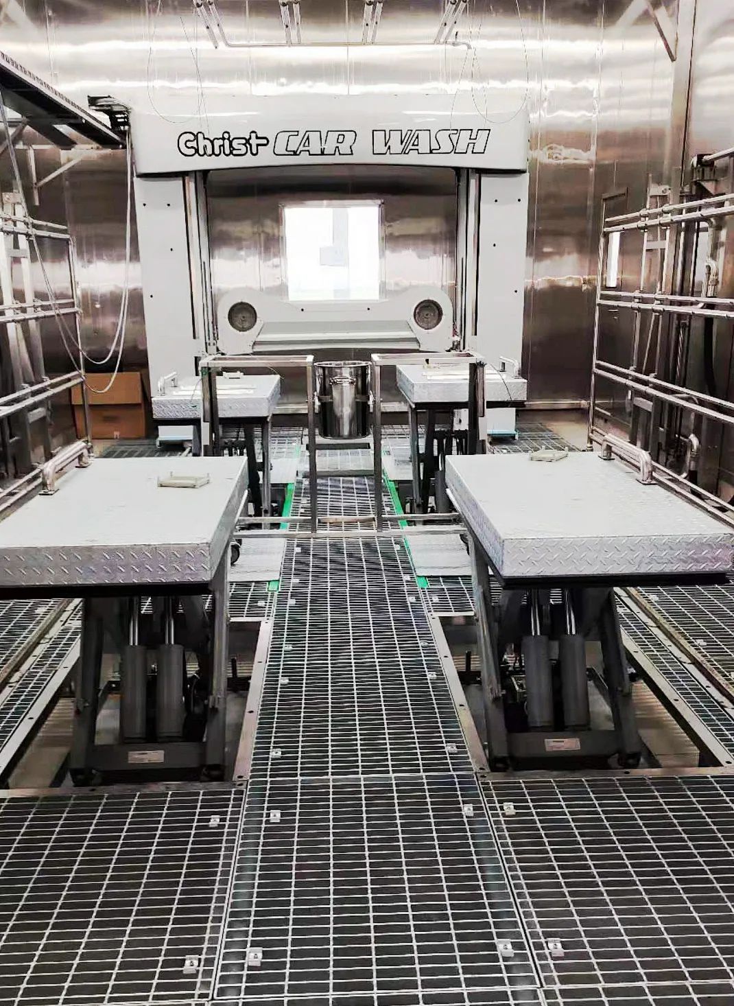 平台在低位时,同地面高度保持一致汽车开上去,四个轮子分别固定在四个平台上喷淋测试即可开始喷淋过程中,四个平台可以同时上升或下降如有特殊要求的或特别形状的产品也可以将某个单台平台升降以便进行多角度全方位喷淋