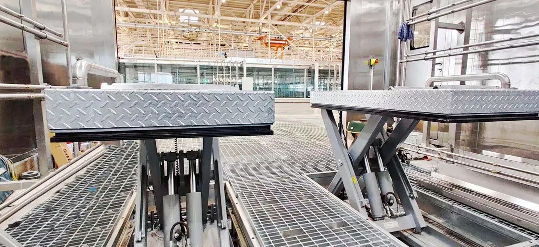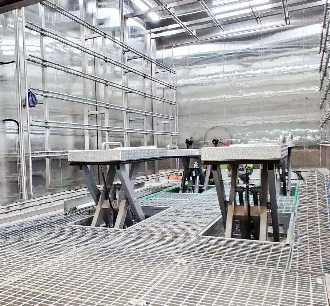 项目简介某大型新能源汽车的淋雨测试线,整车驶入淋雨室测试时,侧边、车身靠近底部等部位,无法多角度作业,喷淋不完全,使得测试效率较低。Marco针对此工况,定制了四柱举升平台,使得淋雨测试效率大大提高。