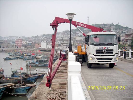 桥梁检测车主要特点:该桥梁检测车(HZZ5240JQJ16型)是目前桥梁检测车中较先进的,技术领先,安全性能高。该车采用瑞典Volvo底盘,车轴为独特的气动悬挂系统,汽车停稳后,放掉空气,车身重心下降,可保证车辆稳定性,避免车辆晃动。该车配备液压式支腿连平衡实心轮,可保证车身及工作台的水平及稳定性;同时配有桥梁检测车中独一无二的同步液压移动系统——液压马达,当工作平台在桥底下操作时,可使用液压马达驱动整车及平台同时向前或向后慢速移动,有效保证了车辆行驶的稳定性。