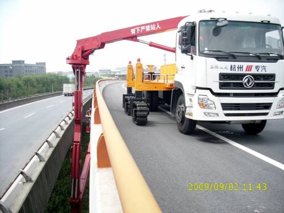 该车工作平台总长20m,可以在桥下延伸19m;平台上可容纳5~6个人同时开展工作,平台末端可载重300kg。该车平台在桥底下工作时,可旋转180°,平台最深可下降至9m;该作业平台还可跨越2.0m高度的隔音板及2.4m宽度的人行道,便于检测工作的开展。另外,检测车上还配备了发电机、工具箱、升降梯、变道指示等辅助工具,可有效保证桥梁检测工作的顺利进行。