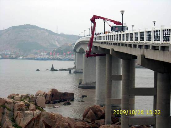 桥梁检测车主要特点:该桥梁检测车(HZZ5240JQJ16型)是目前桥梁检测车中较先进的,技术领先,安全性能高。该车采用瑞典Volvo底盘,车轴为独特的气动悬挂系统,汽车停稳后,放掉空气,车身重心下降,可保证车辆稳定性,避免车辆晃动。该车配备液压式支腿连平衡实心轮,可保证车身及工作台的水平及稳定性;同时配有桥梁检测车中独一无二的同步液压移动系统——液压马达,当工作平台在桥底下操作时,可使用液压马达驱动整车及平台同时向前或向后慢速移动,有效保证了车辆行驶的稳定性。