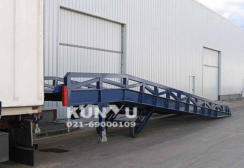 上海坤誉采用断面结构性能优越的H型钢作为登车桥主梁。具有结构稳定、皮实耐用,且外形美观的显著特点。移动式登车桥又叫地面登车桥,主要用于现场无装卸货平台或需要流动装卸货物的作业场所。地面登车桥相当于一个移动的、可调节自身高度的钢结构斜坡,手动操作液压杆可轻松实现登车桥的坡度调整,达到灵活地搭接不同高度的卡车车厢,叉车同样能直接驶入卡车车厢内部进行批量装卸作业。