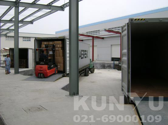 ◇两个20吨的安全支撑脚装置,支持满车装卸时,车厢内没有活页搭板搭连位置情况下,调节板无须伸开活页搭板,叉车可直接驶上调节板装卸第一排货物;支持装卸作业时,货车意外驶离情况下,支撑脚支撑板面保持平台水平位置,减少叉车或操作人员摔下平台的危险。
