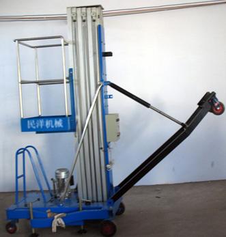 单柱铝合金升降机:该系列产品为室内型,广泛适用于星级酒店,大型超市等各行业大厅、厂房内的高空作业,具有升降平衡,操作方便,能进入一般门厅,可随意进出电梯且耗电少、无污染、工作时不伤地面,可用于贴墙工作及探出作业,工作无死角。单立柱式铝合金电动升降机配上龙门跨架附件,非常适合于影剧院、会堂、教堂等的维修工作。该龙门跨架组装容易,操作省力,移动灵活,可跨越高度达1.1m的固定座椅等障碍物,并可在台阶上稳定作业。高强度矩形钢管制作,刚性、稳定性好。配有万向脚轮,机动灵活。两端架跨距可调,能适用于跨越不同障碍物的要求。两端架垂直可调,可用于一定坡度的斜面或台阶上作业。