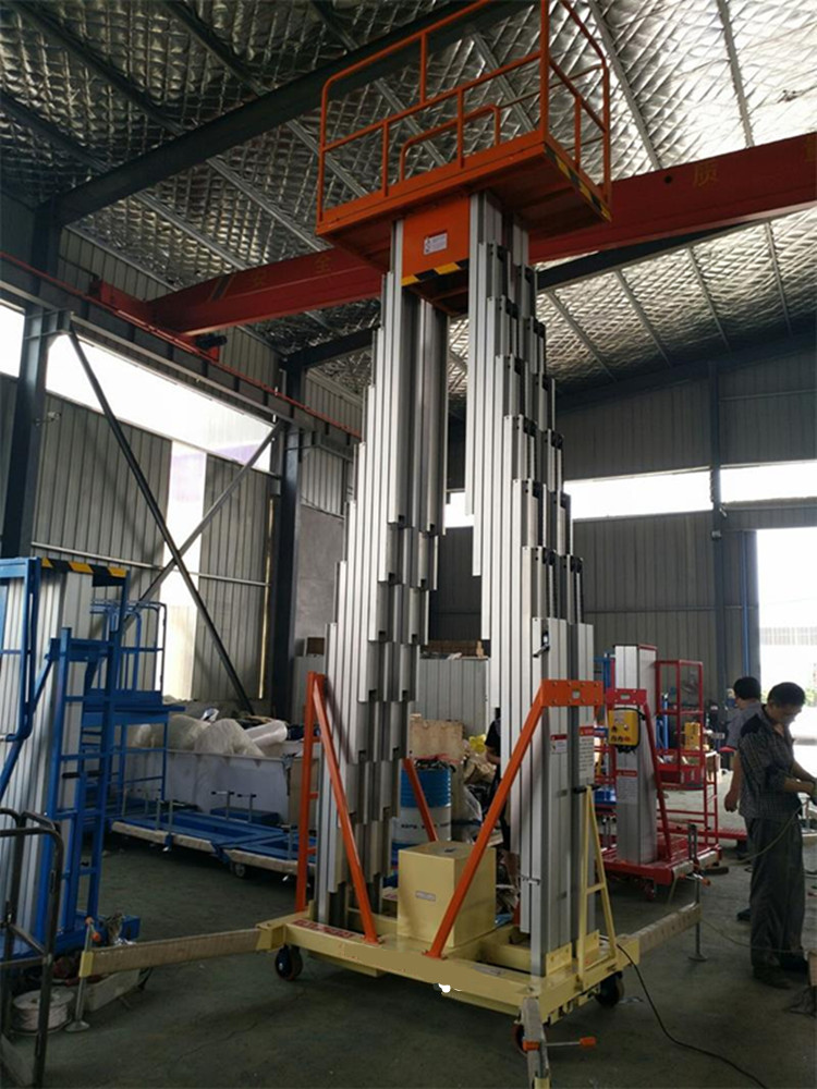 2. 双立柱铝合金高空作业平台:计的新一代产品,整体采用高强度铝型材精制而成由于型材强度高,使升降台的偏转与摆动极小。采用双桅柱式结构,载重量大,平台面积大,稳定性极好,运转灵活,推行方便。它轻盈的外观,能在极小的空间内发挥最高的举升能力。该升降机广泛用于厂房、宾馆、大厦、商场、车站、机场、体育场等。可用作电力线路、照明电器、高架管道等安装维护,高空清洁等单人工作的高空作业。