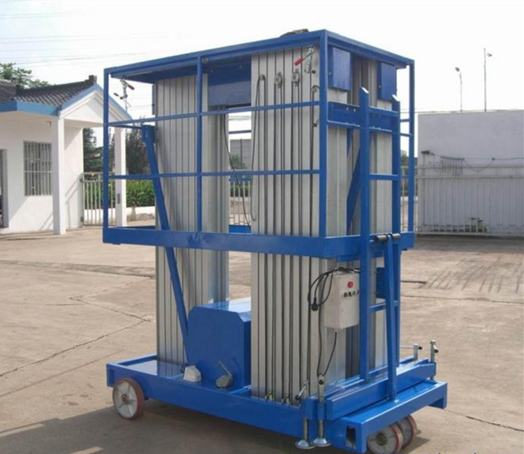 4. 四立柱铝合金高空作业平台: 整体采用高强度铝型材精制而成由于型材强度高,采用四桅柱式结构,稳定性极好,运转灵活,载重量大,平台面积大,推行方便。它轻盈的外观,能在极小的空间内发挥最高的举升能力。使升降台的偏转与摆动极小。该升降机广泛用于厂房、宾馆、大厦、商场、车站、机场、体育场等。可用作电力线路、照明电器、高架管道等安装维护,高空清洁等单人工作作业的高空作业
