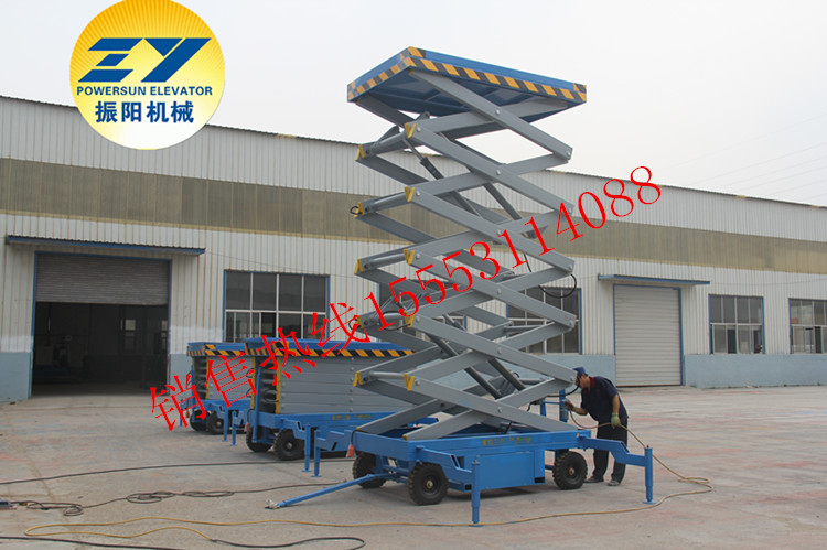 (三)移动台面抽拉升降机是用途广泛的高空作业专用设备。在有障碍常规升降平台台面无法满足工作条件时,采用该产品就可正常工作,台面可抽拉产度0.5-1.5米。它的剪叉机械结构,使升降台起升有较高的稳定性,宽大的作业平台和较高的承载能力,使高空作业范围更大、并适合多人同时作业。升降动力分为220V或380V电源,柴油机,或电瓶动力源,特殊环境也可采用防爆泵站及防爆电器。升高4——22米,载重0.3—3吨。采用意大利和国产液压泵站,台面使用防滑绝缘扣板,具有防滑,绝缘、安全,请放心使用。它使高空作业效率更高,安全更保障。