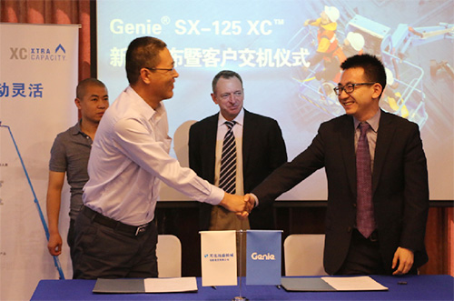 高空作业平台事业部高级销售经理齐斌先生在签订战略合作协议时也发表了自己的看法:“新型Genie SX-125 XC直臂高空作业平台能为租赁公司带来更高的投资回报率,创造更多应用机会。Genie SX-125 XC是由特雷克斯常州工厂的设计团队主导研发,并实现了批量生产,面向全球市场供货。他代表着吉尼中国在产品自主研发能和生产效率方面实现了一个新的跨越。拓盛租赁向吉尼采购Genie SX-125 XC 说明了拓盛机械设备全面进军高空作业平台租赁市场的眼光和决心。 此次战略合作协议的签订更是启动了双方携手并进北方高空作业平台租赁市场的步伐,表达了吉尼在北方市场的长期投入的决心。我们期待双方的战略合作能为更多的高空作业平台使用者提供创新的产品和全方位服务解决方案, 共同推动整个高空作业平台租赁行业的稳步发展,以合作共赢理念引领发展之路。”