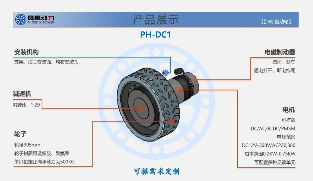 【PH-DC】系列适合于室外应用场景,具备较强的越障能力与爬坡能力,具备一定的涉水能力,适合室内外应用的电驱动移动设备和车辆,转动半径小,同时具有较大扭矩输出与驱动牵引力。