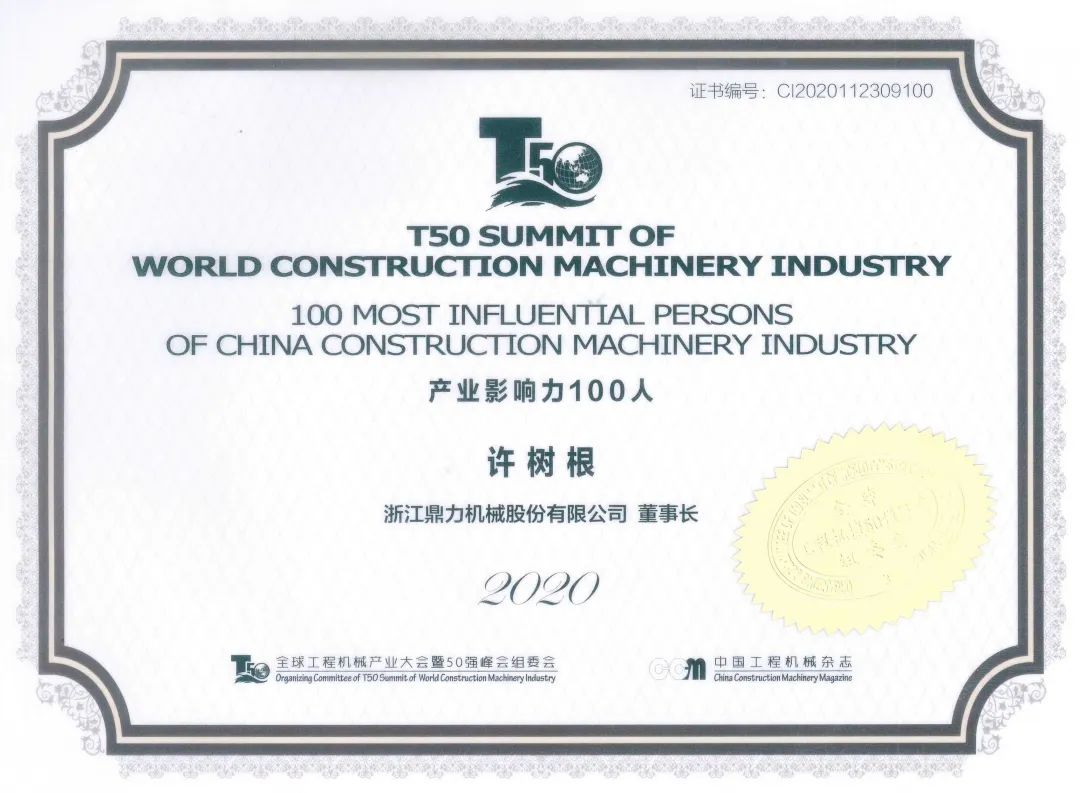 近期,继摘得“中国高空作业设备产业影响力人物”奖项后,鼎力董事长许树根先生又获殊荣,入选“中国工程机械产业影响力100人”。