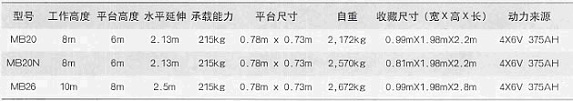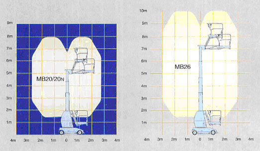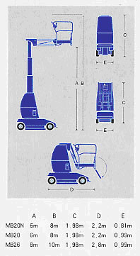 B型 结构紧凑,MB20N只有 81cm 宽,桅杆可 360 可旋转,承载 215kg (两人加工具),提升平稳,单手柄全比例操纵杆。具有 14 度的爬坡能力。 MB20N/26 的工作高度分别为 8m 、 10m ; 300mm 内侧旋转半径,在升高后可以自由驱动,并配备无迹轮胎。动力来自电池。