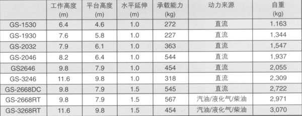 GS系列不同车型的最大工作高度为6.4米至11.6米,平台可向外延伸1米至1.5米。此类平台多为蓄电池直流驱动,适于粗糙路面的车型动力为汽油/液化气/柴油动力。